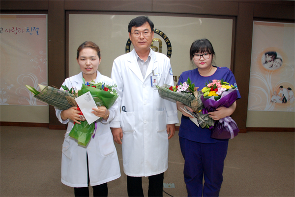 수상은 병원의 발전과 보건의료서비스 향상을 위해 노력한 건강진단센터 배자영 사원이 최우수사원, 5병동 박은미 간호사가 우수사원으로 선정되어 각각 상패와 꽃다발 그리고 소정의 상금을 받았다.
