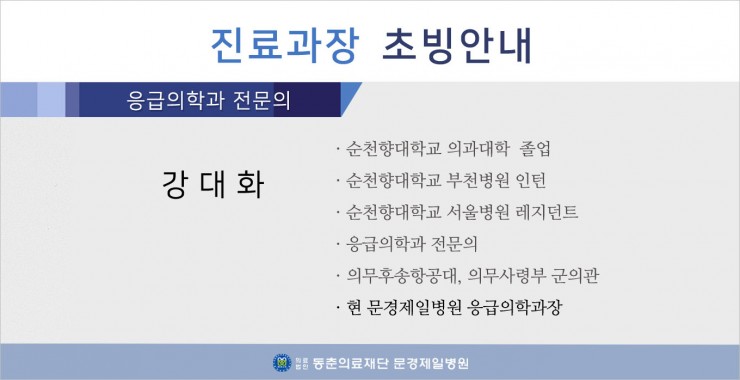 <진료과장 초빙안내 - 응급의학과 (강대화)> 페이지 정보 작성자 문경제일병원 작성일20-05-07 13:07 조회6,338회 댓글0건 관련링크 이전글 다음글 목록 본문 . 댓글목록 등록된 댓글이 없습니다. 이전글 다음글 목록