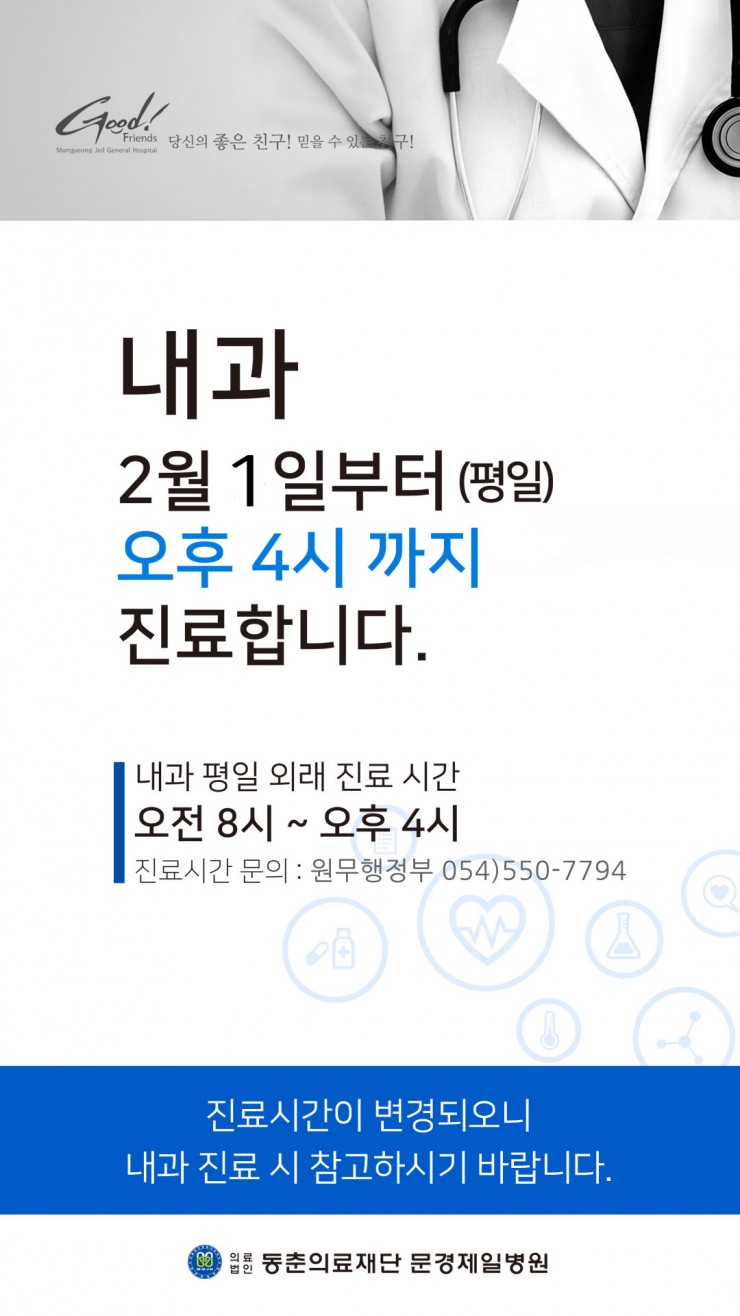 <2021년도 2월기준 내과 평일진료시간 변경안내> 페이지 정보 작성자 문경제일병원 작성일20-12-31 13:40 조회5,715회 댓글0건 관련링크 이전글 다음글 목록 본문 . 댓글목록 등록된 댓글이 없습니다. 이전글 다음글 목록