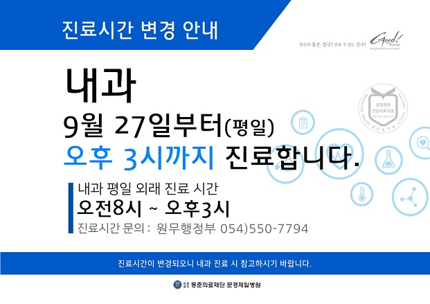 <2021년도 9월기준 내과 평일진료시간 변경안내> 페이지 정보 작성자 문경제일병원 작성일21-09-14 14:46 조회5,515회 댓글0건 관련링크 이전글 다음글 목록 본문 댓글목록 등록된 댓글이 없습니다. 이전글 다음글 목록