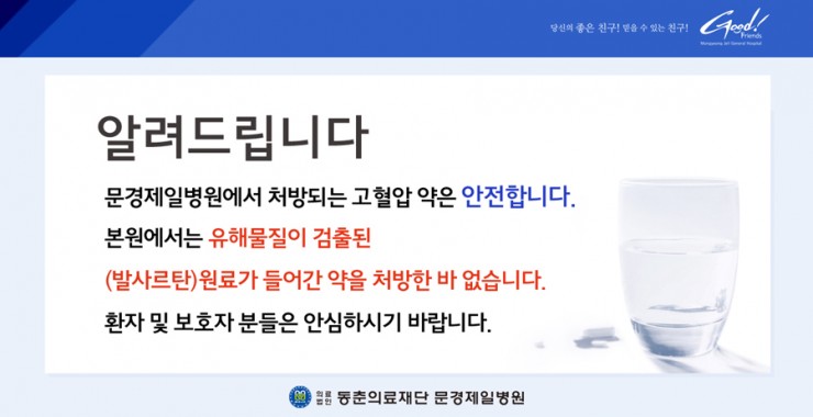 본원에서는 유해물질이 검출된 원료(발사르탄)가 들어간 약을 처방한 바 없습니다.