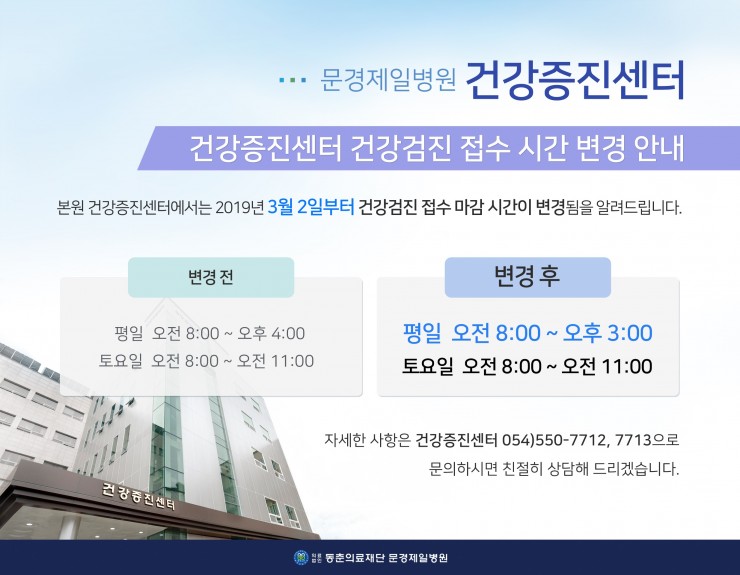 본원 건강증진센터에서는 2019년 3월 2일부터 건강검진 접수 마감 시간이 변경됨을 알려드립니다.