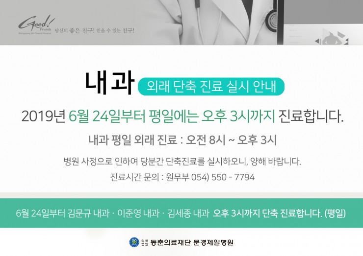 <내과 평일 진료시간 변경 안내> 페이지 정보 작성자 문경제일병원 작성일19-03-31 21:03 조회6,186회 댓글0건 관련링크 이전글 다음글 목록 본문 . 댓글목록 등록된 댓글이 없습니다. 이전글 다음글 목록