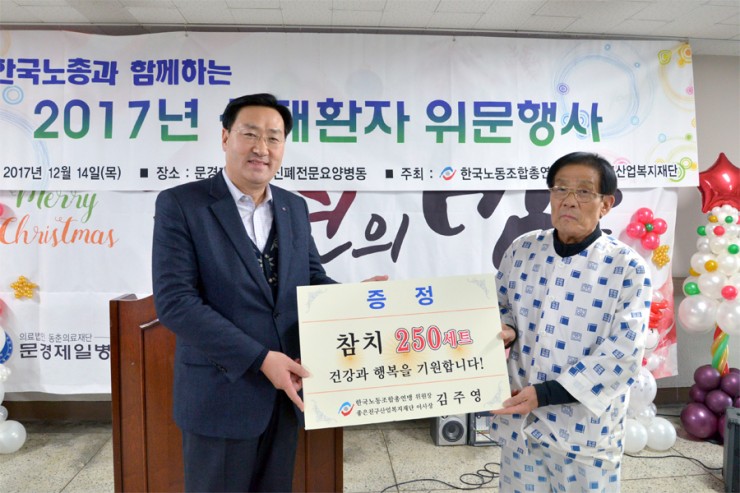 한국노동조합총연맹(위원장 김주영·이하 한국노총) 주관 산재환자 위문행사가 14일 오후 2시 점촌동에 위치한 문경제일병원 진폐전문요양병동에서 열렸다.