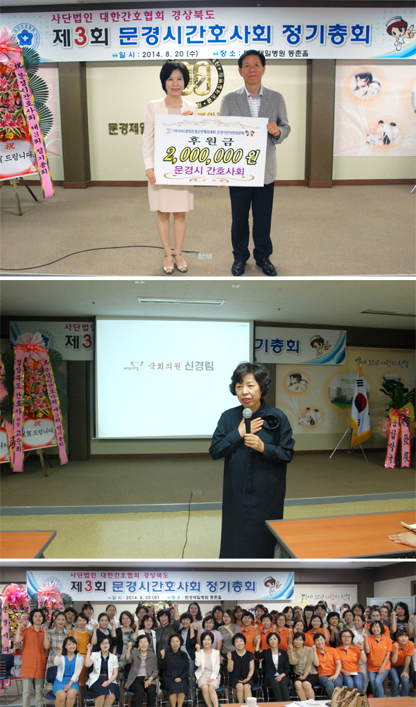 문경대학교 김양신 교수의 사회로 진행된 이번 총회는 신경림 국회의원, 고윤환 문경시장, 이응천 문경시의회의장 등 여러 도의원과 시의원, 그리고 경상북도간호사회 고순희 회장, 경상북도병원간호사회 윤난숙 회장, 문경제일병원 이희섭 병원장, 대구은행 황상철 문경지점장 등 각 지역기관 단체장들을 비롯하여 관내 병·의원, 보건소, 학교, 소방서 등에 근무하는 간호사회원 150여명이 참석한 가운데 1부 개회식, 2부 총회, 3부 특강으로 이루어졌다.