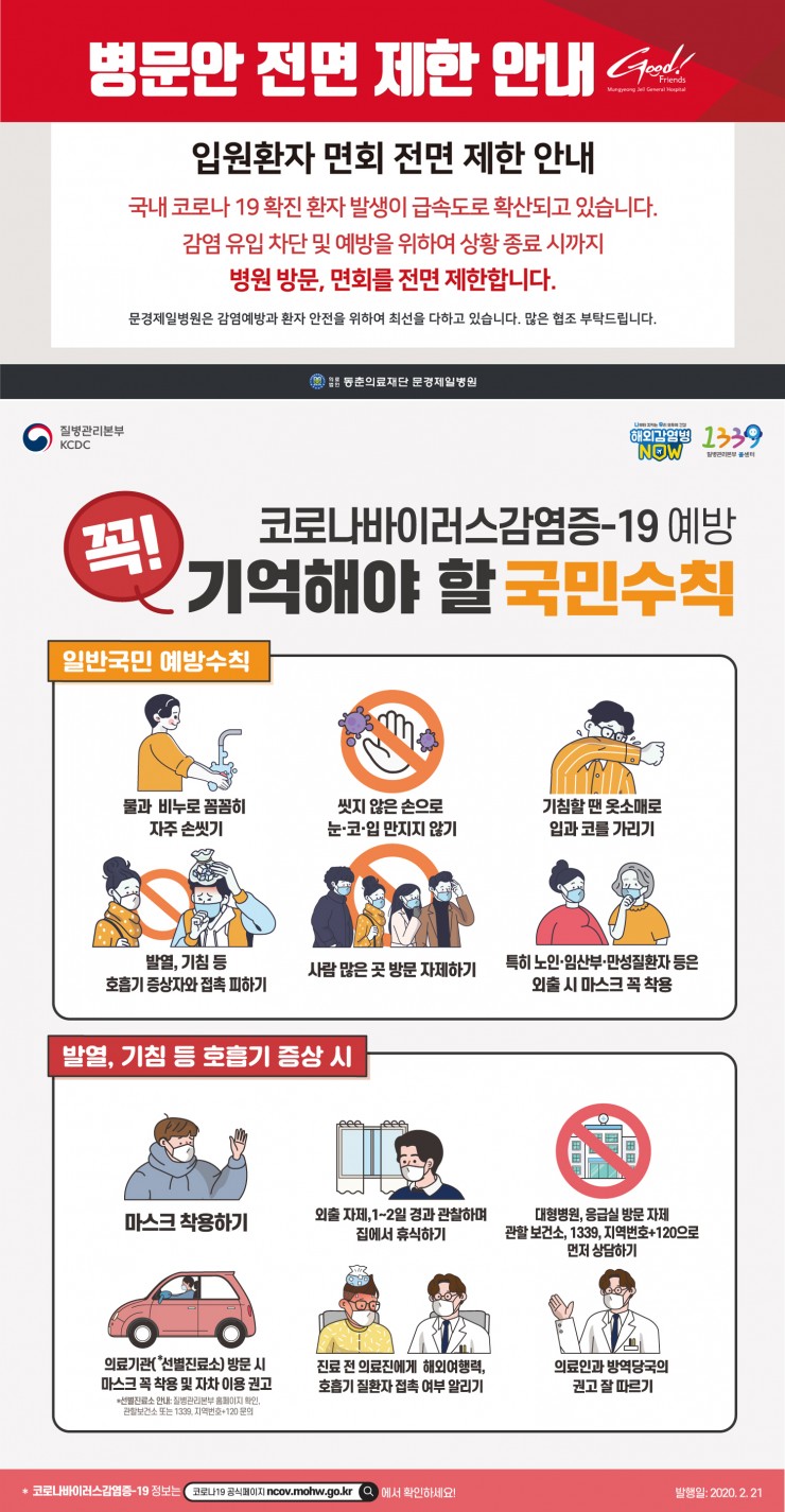 <코로나19 감염증 관련 병문안 전면 제한 안내> 페이지 정보 작성자 문경제일병원 작성일20-01-31 09:05 조회6,329회 댓글0건 관련링크 이전글 다음글 목록 본문 코로나19 확진 환자 발생이 급속도로 확산하여 병문안을 전면 제한하고자 합니다. 댓글목록 등록된 댓글이 없습니다. 이전글 다음글 목록