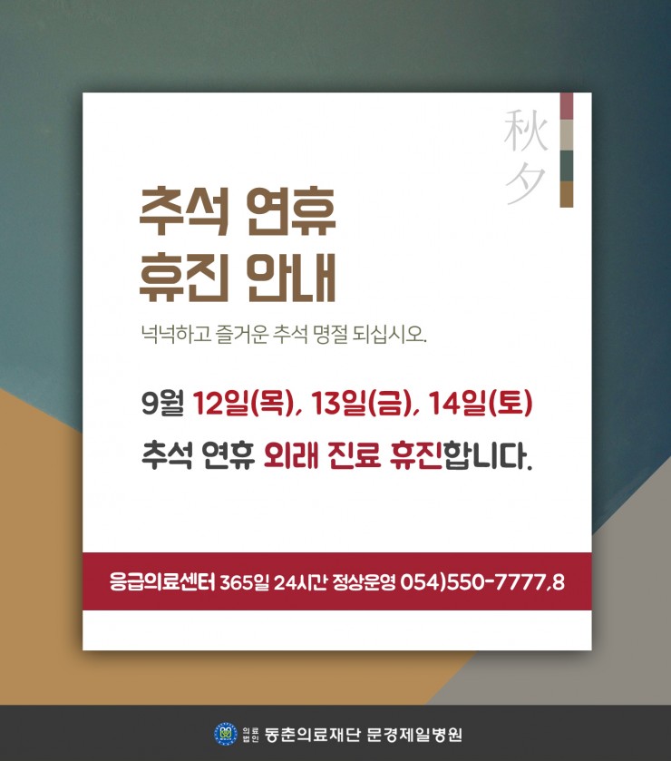 <추석 연휴 휴진 안내> 9월 12일(목) ~ 14일(토) 페이지 정보 작성자 문경제일병원 작성일19-08-26 09:09 조회5,223회 댓글0건 관련링크 이전글 다음글 목록 본문 . 댓글목록 등록된 댓글이 없습니다. 이전글 다음글 목록