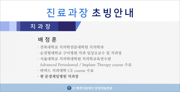 <진료과장 초빙안내 - 치과> 페이지 정보 작성자 문경제일병원 작성일20-01-09 09:41 조회5,634회 댓글0건 관련링크 이전글 다음글 목록 본문 . 댓글목록 등록된 댓글이 없습니다. 이전글 다음글 목록