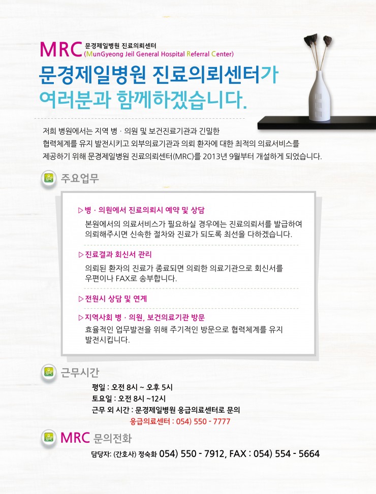 저희 병원에서는 지역 병·의원 및 보건진료기관과 긴밀한 협력체계를 유지·발전시키고 외부의료기관과 의뢰 환자에 대한 최적의 의료서비스를 제공하기 위해 문경제일병원 진료의뢰센터(MRC)를 2013년 9월부터 개설하게 되었습니다.