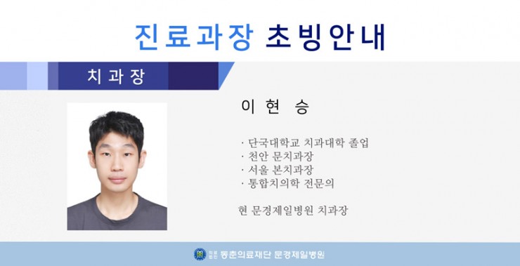 <진료과장 초빙안내 - 치과 (이현승)> 페이지 정보 작성자 문경제일병원 작성일24-01-06 10:31 조회5,550회 댓글0건 관련링크 이전글 다음글 목록 본문 . 댓글목록 등록된 댓글이 없습니다. 이전글 다음글 목록
