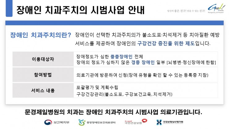 치과 전문의가 장애인 건강 주치의 교육의 모든 과정을 수료하여 2024년 5월 7일부터 치과 치료의 사각지대에 놓여 있던 중증장애인이나 경증장애인(뇌병변·정신장애에 한함)에게 주기적 구강건강 관리를 통해 치아건강 증진에 도움을 드리기 위한 서비스를 제공하고 있습니다.